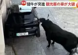 観光客の車、闘牛にメチャクチャにされる